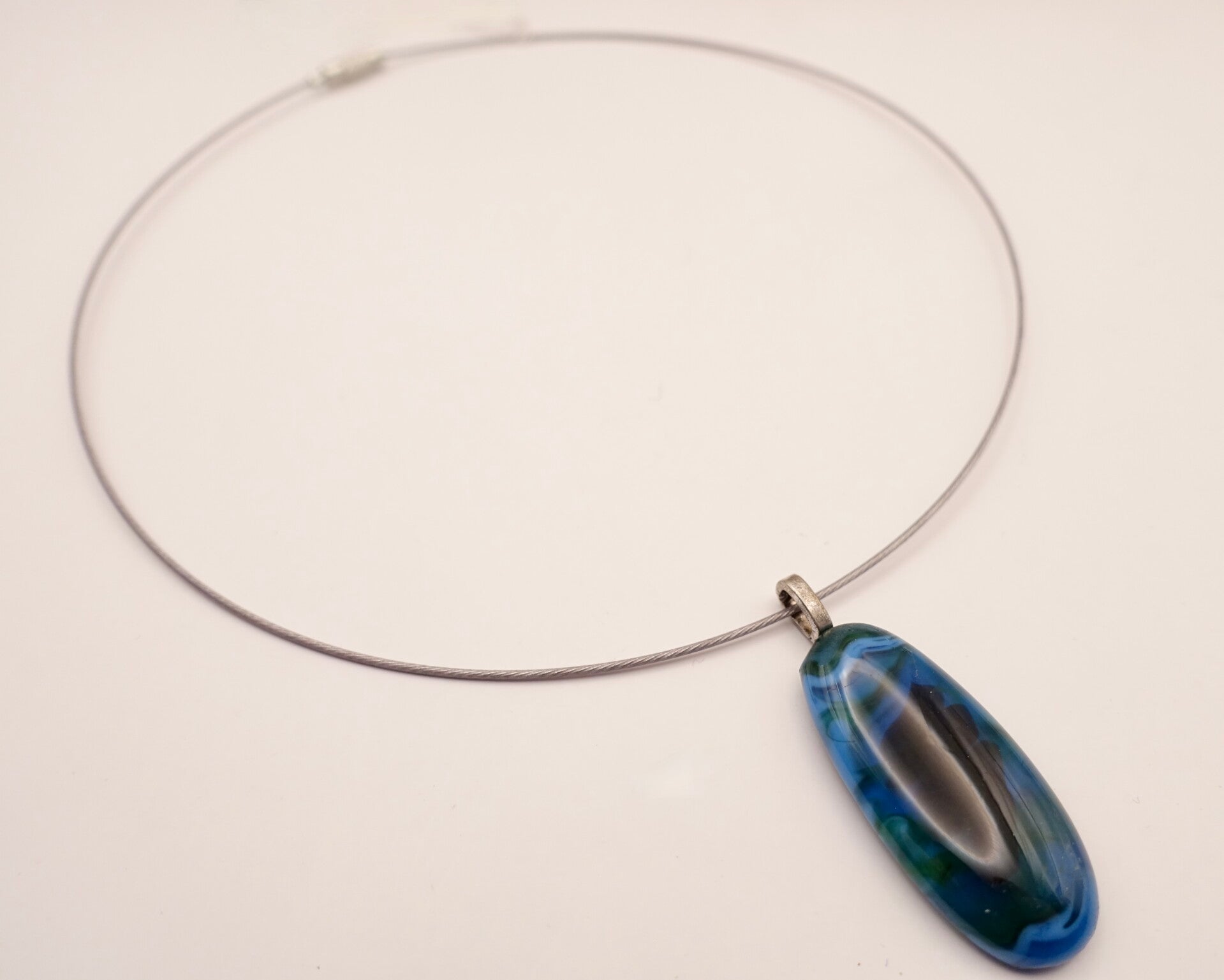 Bijzondere hanger in turquoise/petrol aan suede ketting, dus NIET aan spang. Draagt prettiger. Mooi gevlamd.