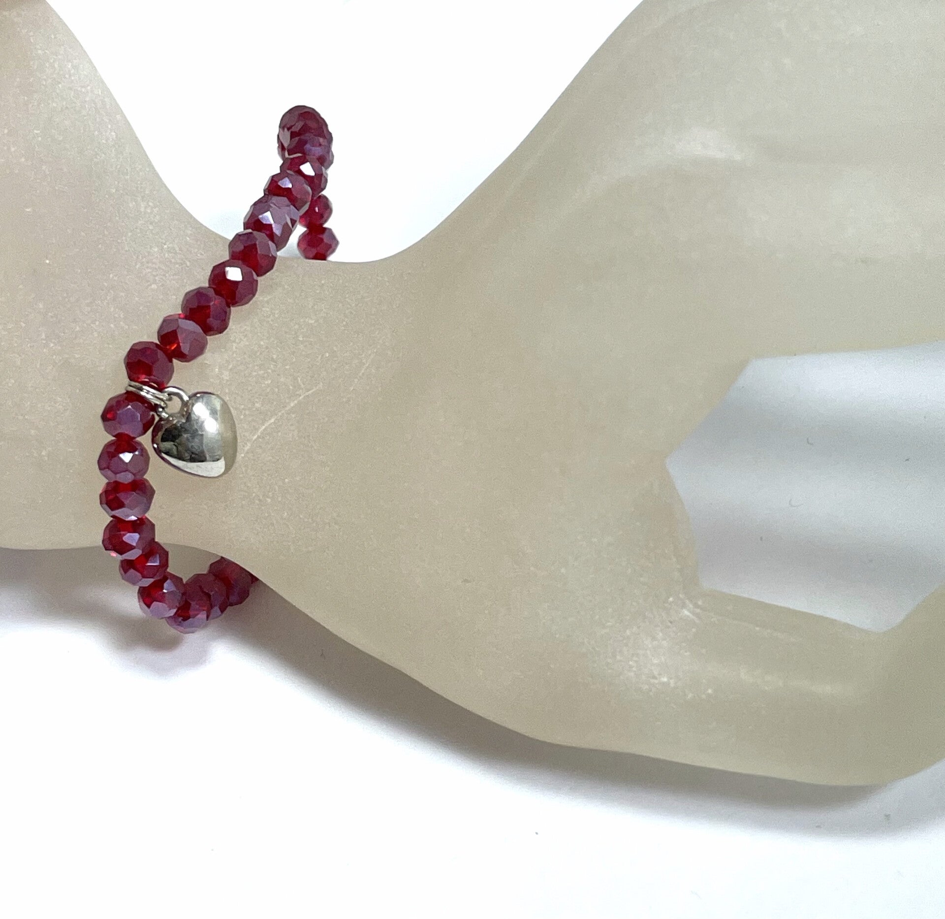Donkerrood, elastisch armbandje met hart-bedeltje. Draag hem solo of als set.