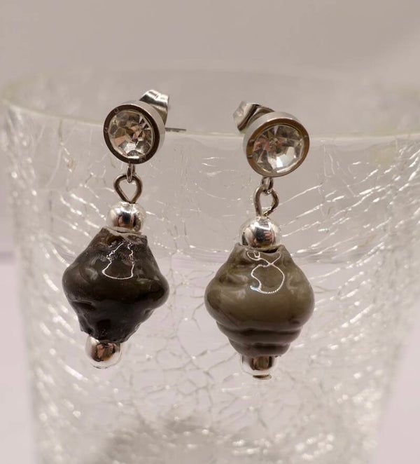 Handmade oorbellen in taupe aan strass stekertje. In eigen atelier gemaakt aan de brander. Lengte ca. 2,5cm.