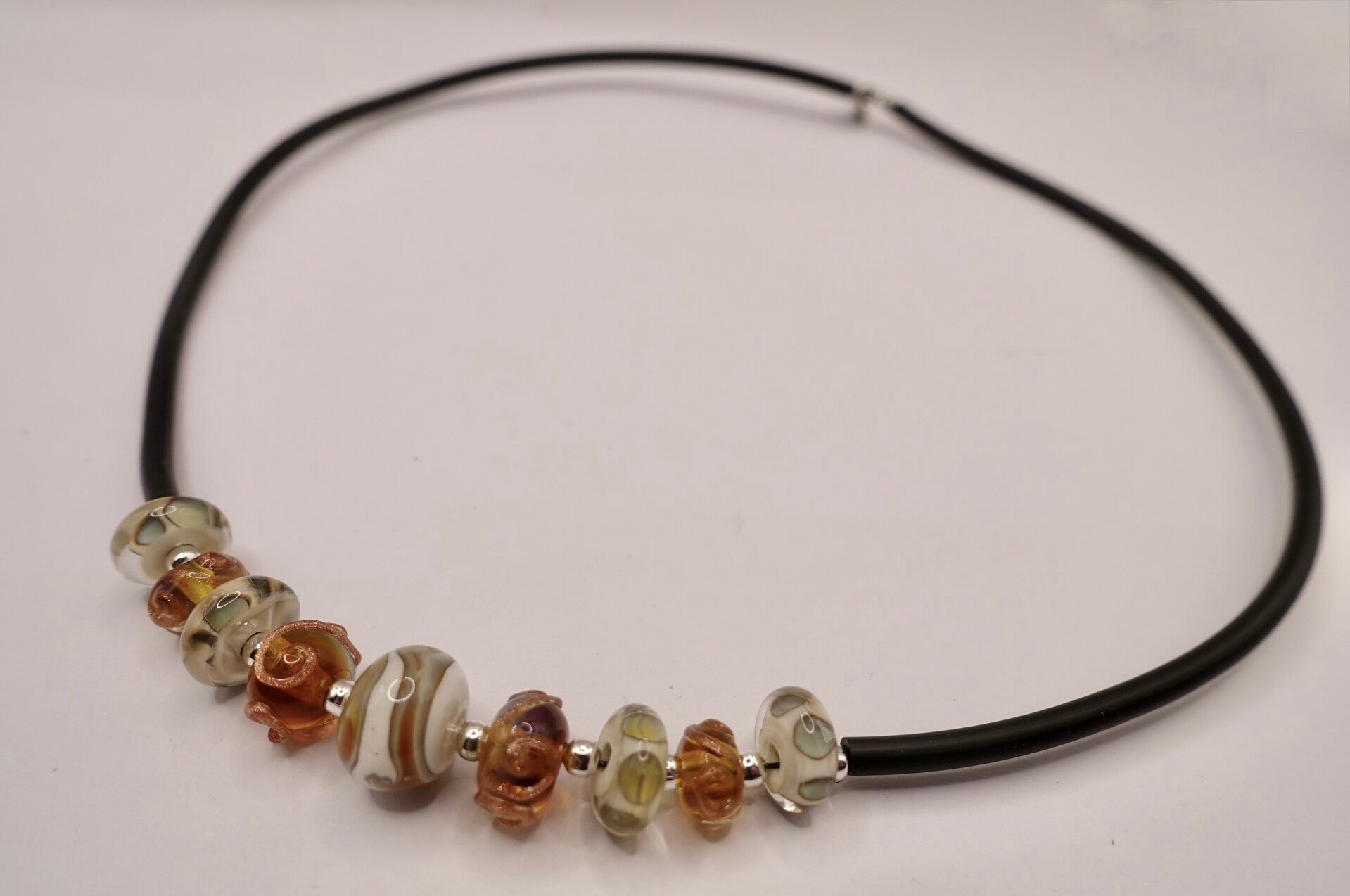 Ecru, topaas, groen kettinkje van kleine handgemaakte kralen, met accenten van zilverglas. De handgemaakte kraaltes zijn aangekocht, de ketting is gemaakt in eigen atelier. Een plaatje! Heel fijntjes.