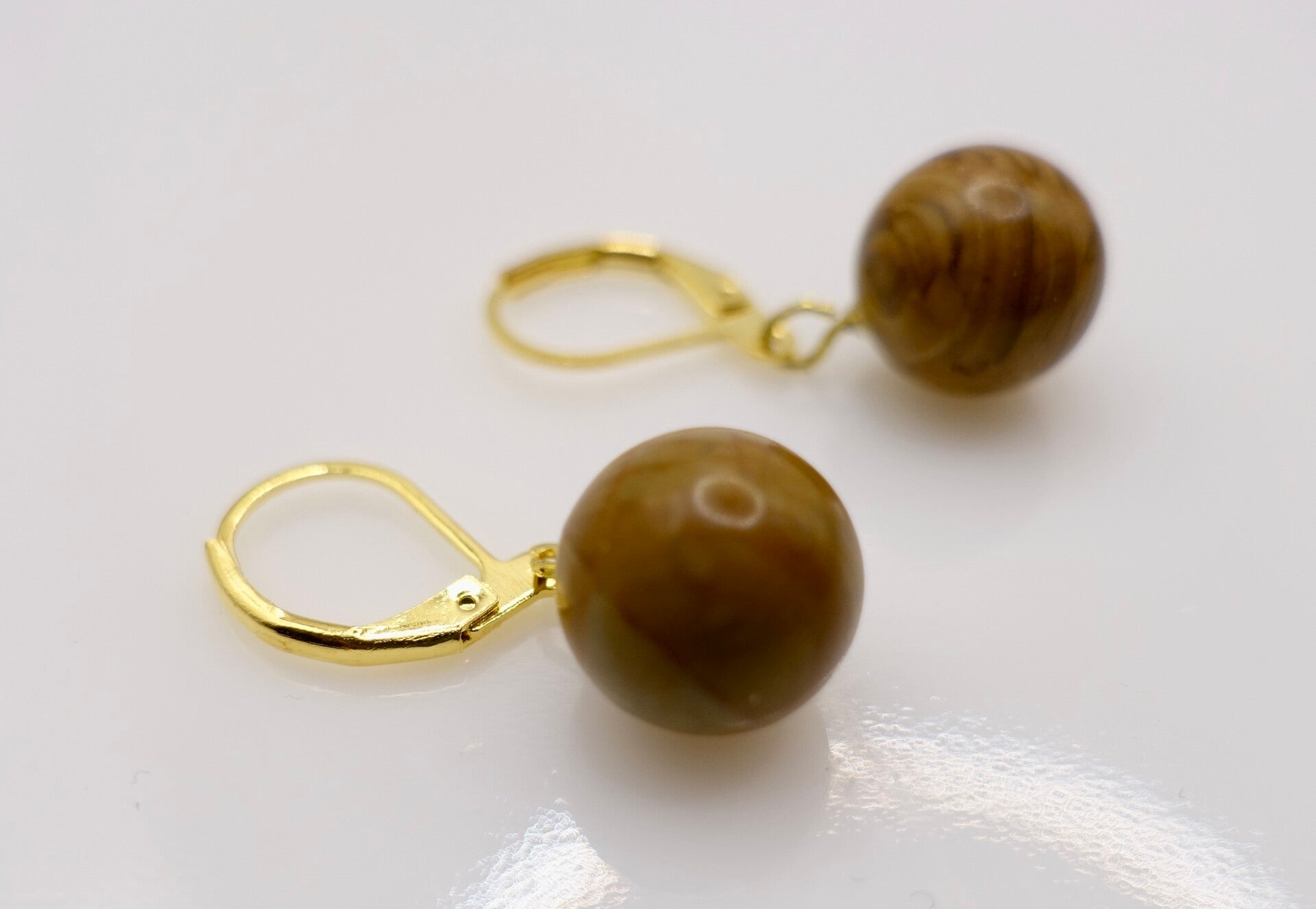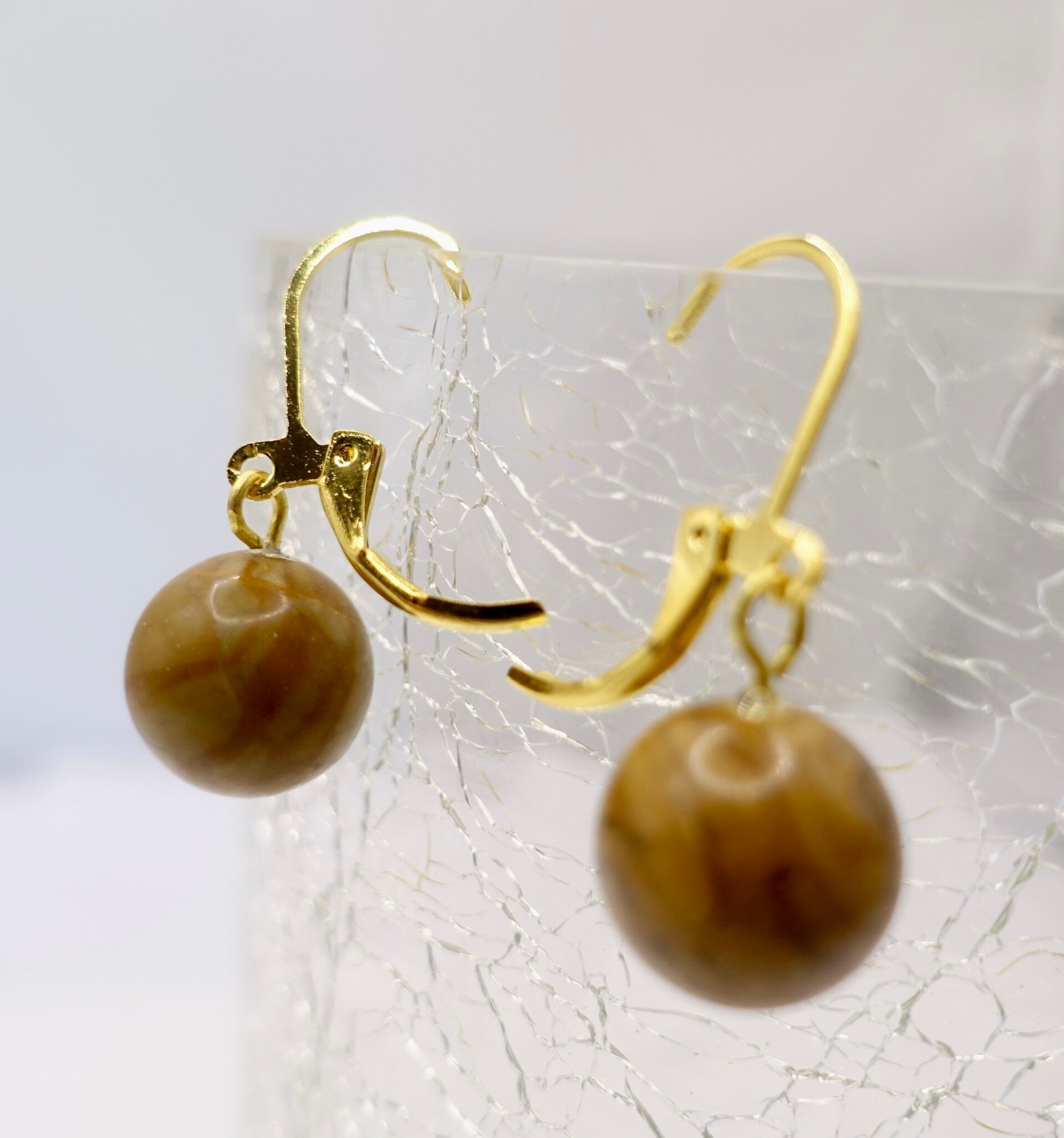 Landschap jaspis oorbellen aan DQ goudmetalen hangers. Houtnerf motief. Natuurproduct dus allemaal iets andere tekening. Totale lengte ca. 3cm.