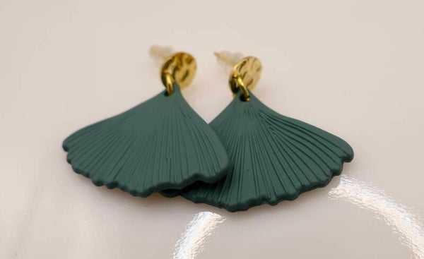 Diep donkergroen/petrol kleur, speelse oorhangers van resin; lengte ca. 3,5cm. Aan goudmetalen getrommelde DQ oorstekertjes.