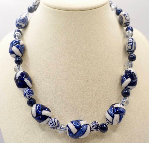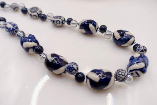 Korte ketting van Delftsblauwe kralen. Leuk met de oorbelletjes die je ook in mijn webshop kunt vinden.