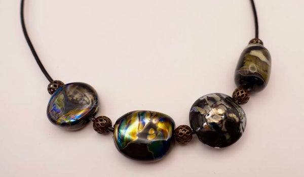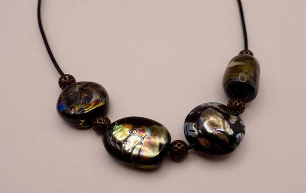 Handgemaakte zwarte kralen, uit eigen atelier, met tinten roze, turquoise, etc. in mooie techniek. Aan leren kettinkje, afgewerkt met open metalen draadkralen.