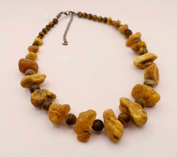 Amberkleurige ketting van barnsteen en versteend hout. Prachtig, rough barnsteen, superlicht in tegenstelling tot wat je verwacht. De totale ketting weegt slechts 109 gram. Heel apart!