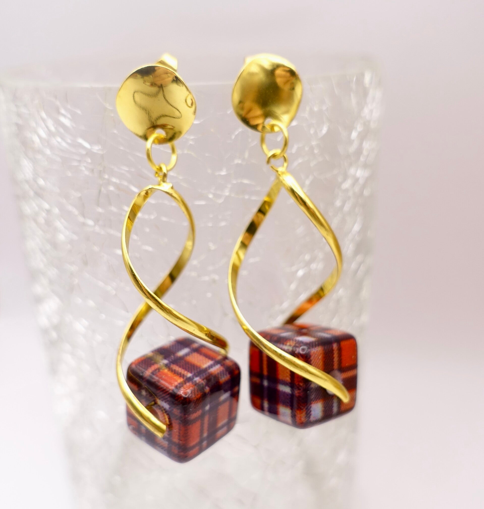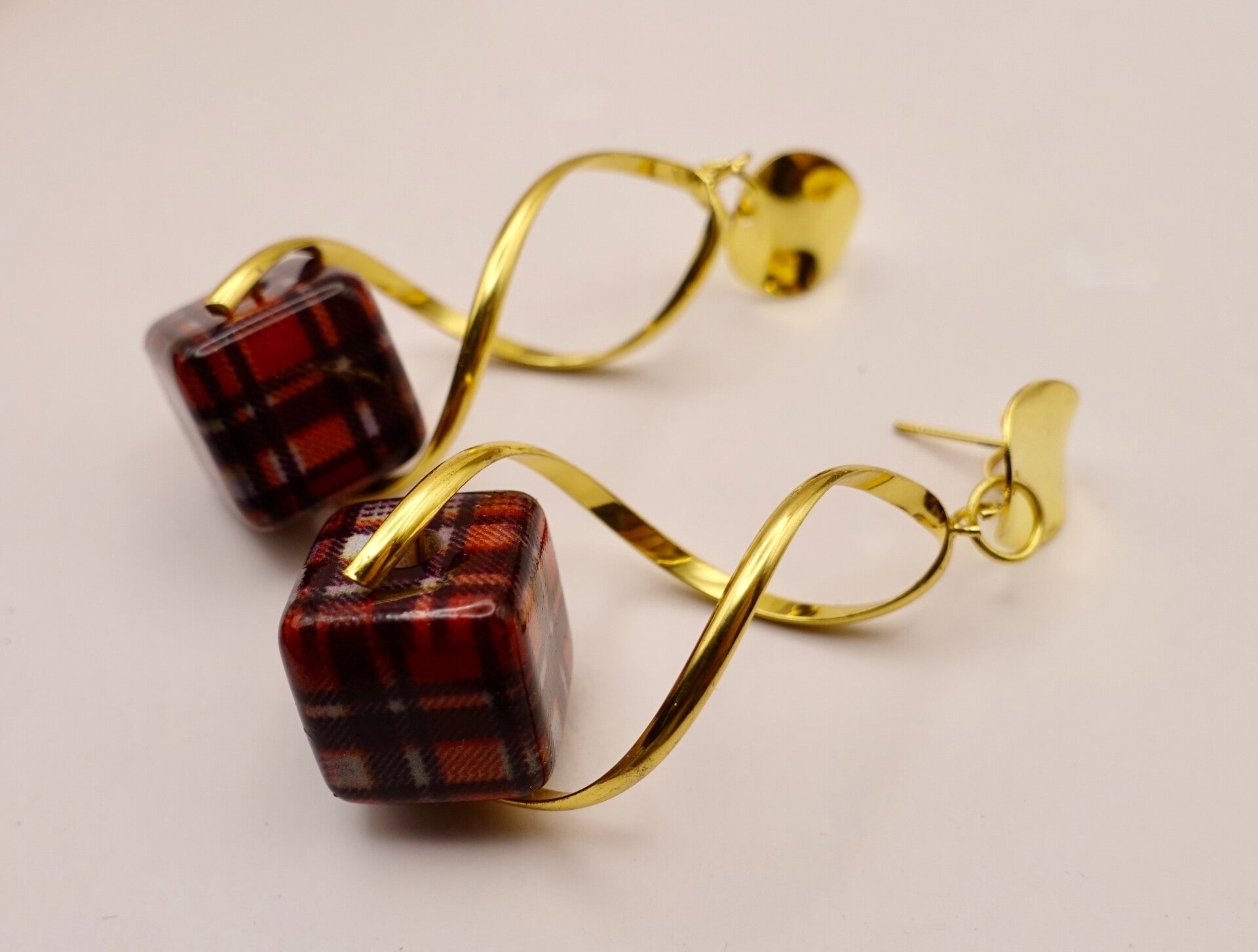 Rood met goudmetalen oorhangers in Schotse ruit. Aan prachtige, gedraaide hangers aan DQ stekers.