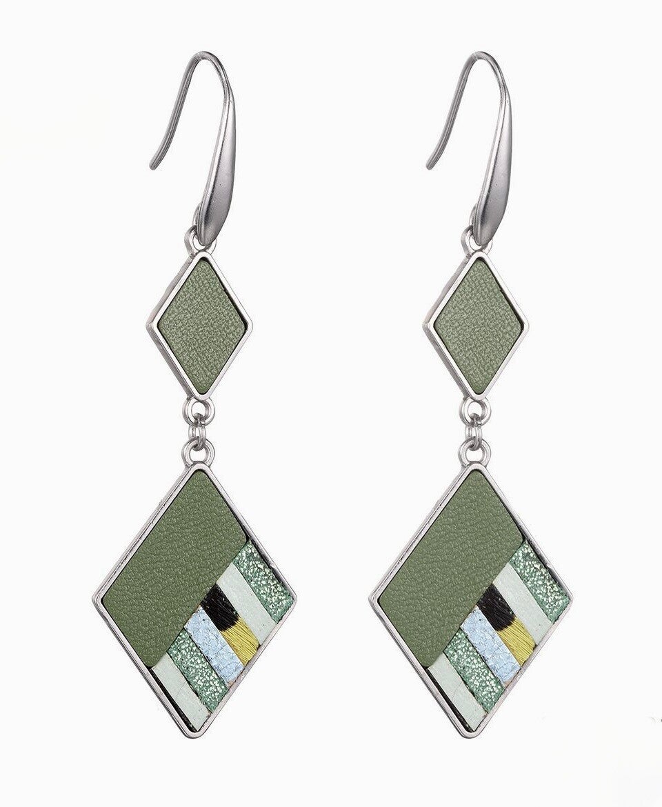Groen leren oorhangers met zilvermetalen stekers afgewerkt. Lengte ca. 6,5cm.
