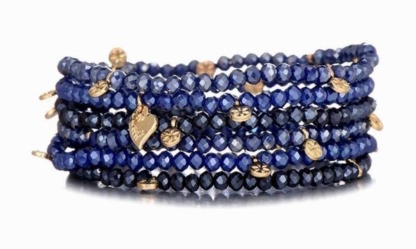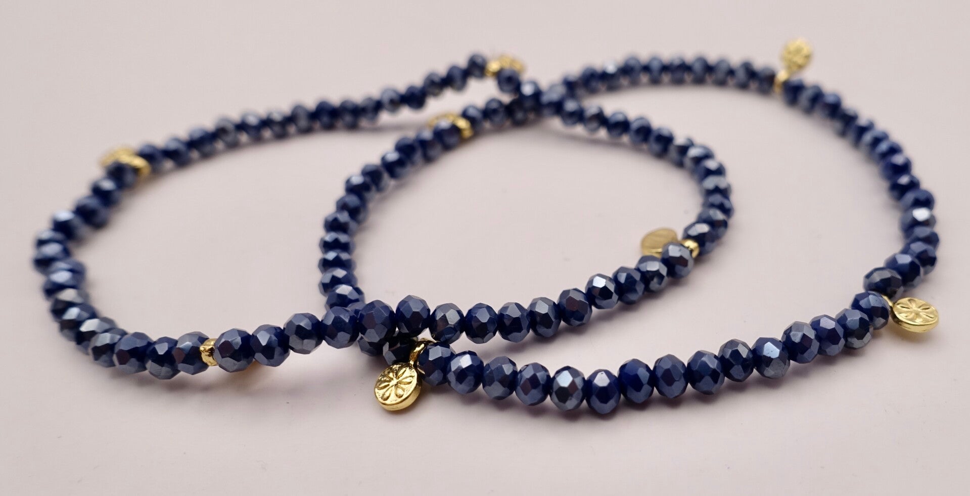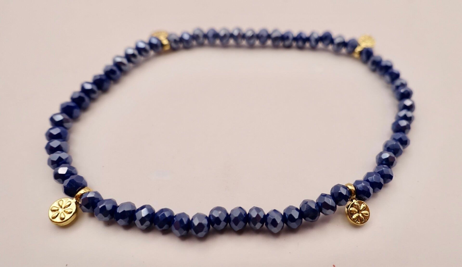 Donkerblauw, heel fijn armbandje met goudmetalen bedeltjes. Leuk om met meerdere armbandjes tegelijk te dragen.