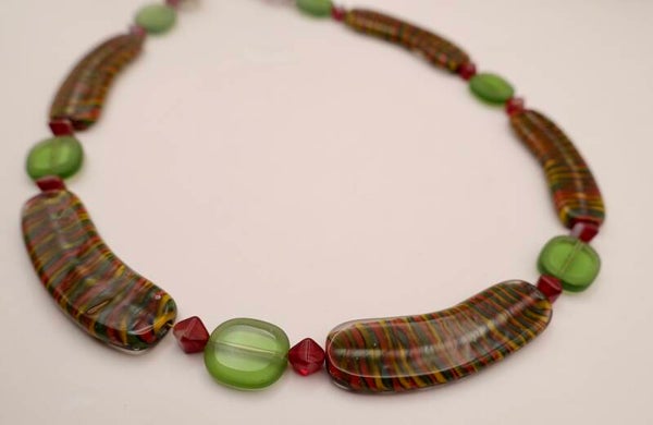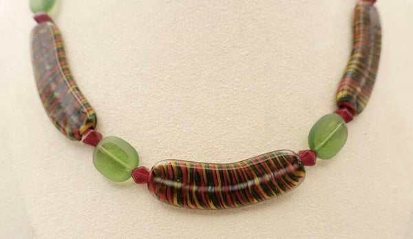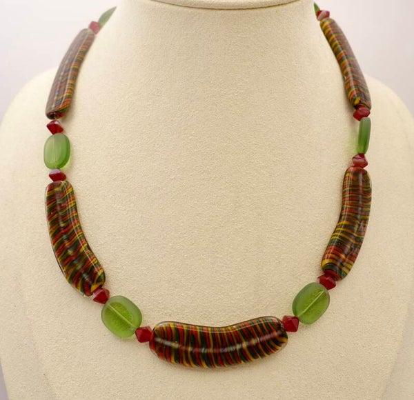 KKmix014824: Rood, groen, oker en terra ketting van o.a. borosilicaat glas.