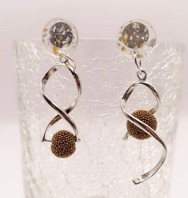 Aparte, brons/goudkleurige, Bohemian oorbellen aan asymmetrische, gegolfde hangers. Mooie kralen, gevat in aparte hangers aan resin stekers.
