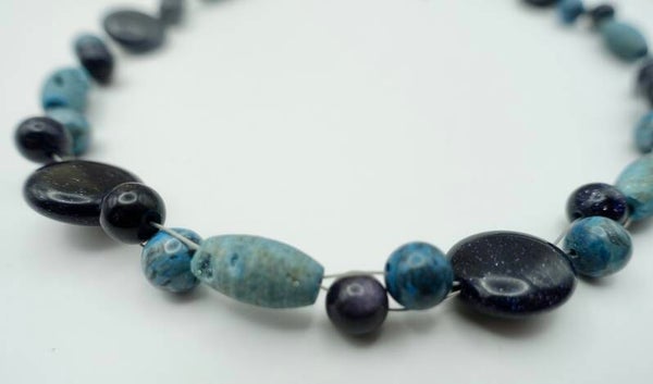 Diverse blauwtinten ketting van donker Cairo nacht steen met goud spikkeltjes, druzy agaat en jaspis. Heel licht en fijntjes.