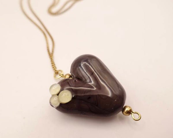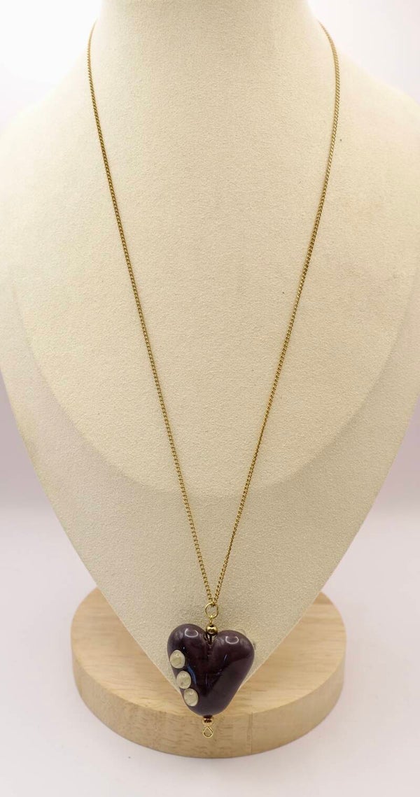 Warm paarse hart-hanger aan goudkleurig kettinkje. Prachtige, dieppaarse kleur, met ecru afgewerkt.
