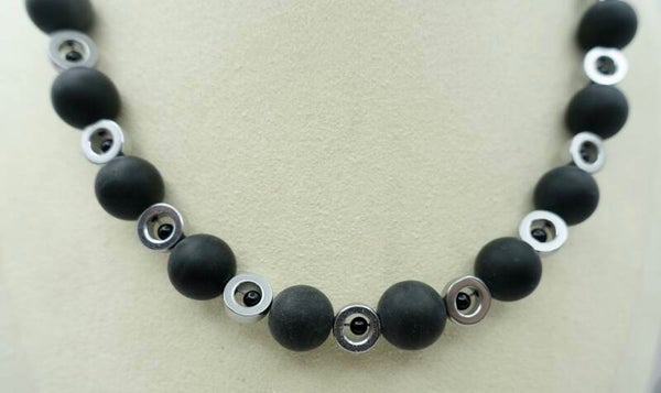 Stijlvolle zwarte met zilveren ketting van onyx met hematiet. Zo prachtig van eenvoud. Mooie, pure materialen. Ook leuk met oorbellen OBzw014924.