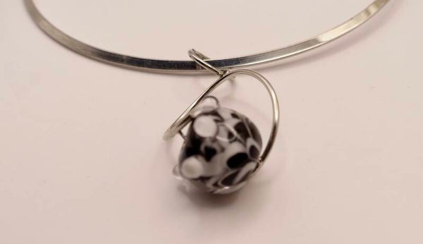 Prachtige, zilvermetalen spang met handgemaakte, wisselbare hanger in bloemmotief, diverse laagjes over elkaar, in zwart/wit.