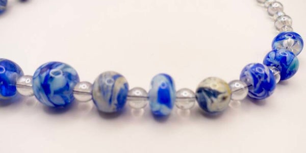 Ketting van handgemaakte kralen in diverse blauwtinten. Meerdere technieken, o.a. in bloemmotief, gevlamd, met ivoor. Elke kraal is uniek.