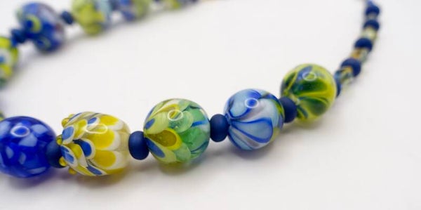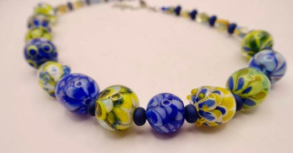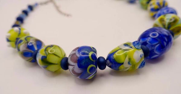 Schitterende ketting in blauw, groen, geel, amethyst van handgemaakte glaskralen. De meeste kralen zijn gemaakt met een speciale techniek: Dahlia/Chrysant bloemen. Elke kraal kost ca. 30-45 minuten om te maken. Het is een heel precies, secuur werk. Maar het resultaat is er dan ook naar. Een plaatje!