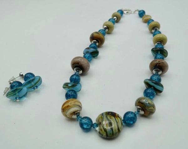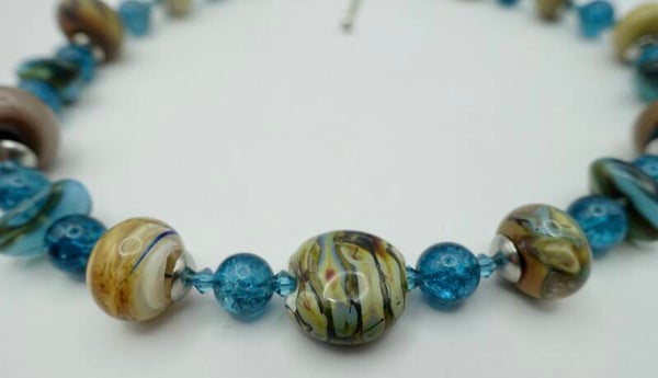 Ketting in petrol, ecru en taupe. Handgemaakte glaskralen. O.a. met zilverglas. Prachtige tinten! Ook leuk met oorbellen OBpetr011025.
