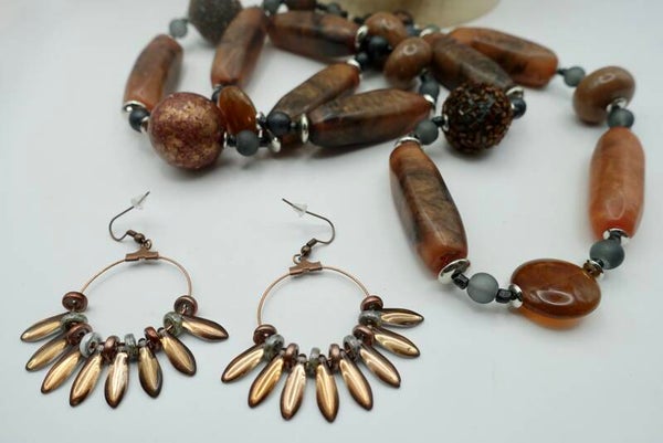Lichte, lange ketting in terra/bruin tinten van glas, keramiek en resin. Ook leuk met oorbellen OBbr011025.