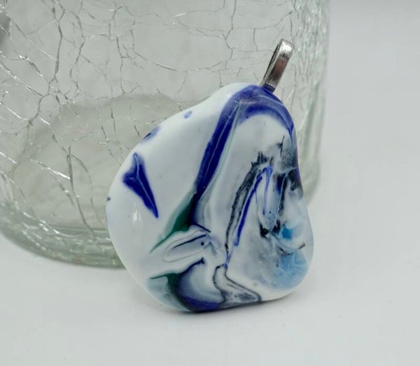 Handgemaakte glashanger in gevlamd blauw. Afmeting ca. 3,5 x 5cm. Rubberen, zwart of blauw kettinkje is bij te leveren voor €2,50.