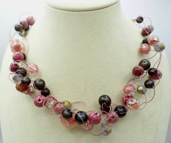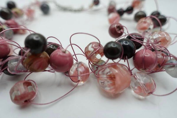 Krulketting in oudroze, antraciet en paars, metallic. Prachtige vensterkralen, 3-D kralen, keramiek, etc. Mooi speels. Leuk bij grijs, ecru, zacht roze tinten, naturel, etc.