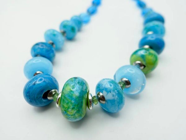 Ketting in turquoise, limoncello en andere groentinten. Met zilvermetalen tussenkraaltjes en kapjes. Allemaal handgemaakte kralen. Een plaatje!