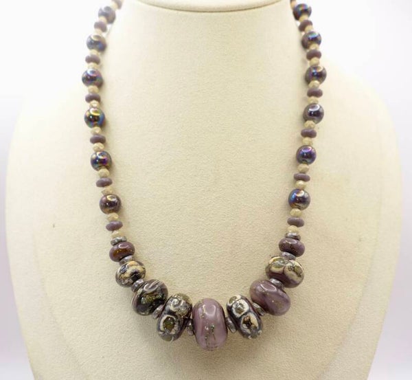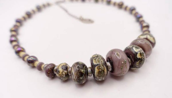 Handgemaakte kralen uit eigen atelier. In zachtlila, taupe en ecru, bewerkt met 935 zilverdraad, waardoor er kleine bolletjes zijn ontstaan. Heel verfijnd afgewerkt in de hals en nek.