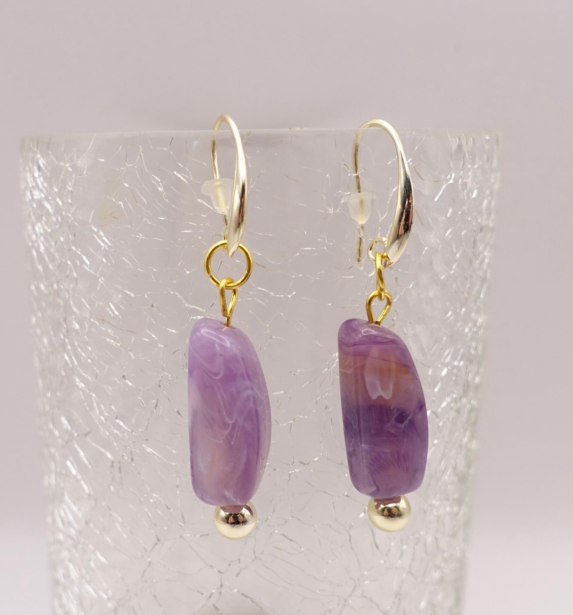 Zachtpaarse natuursteen, gevlamde pegels aan 12K/14K goldfilled oorhangers. Totale lengte 5,5cm. Aan goldfilled hangers en met goldfilled kraaltjes.