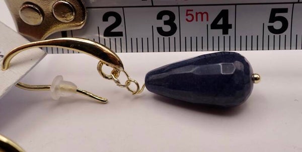 Donkerblauw jade pegels aan 12K/14K goldfilled oorhangers en nietstiften. Totale lengte ca.5cm.