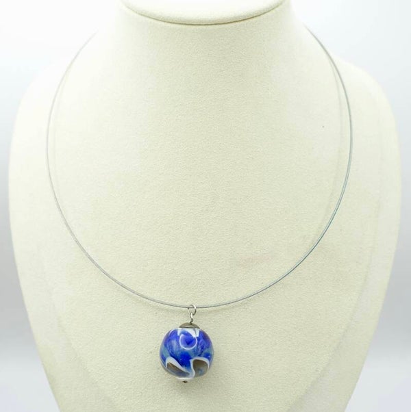 KKbl012125: Handgemaakte glazen hanger in blauwtinten, afgewerkt met kralenkapjes.