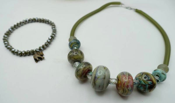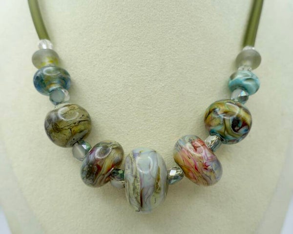 Ketting in pasteltinten van handgemaakte, zilverglas glaskralen. In zachtgroen, roze, taupe, turquoise, etc. Zachte uitstraling. Licht in het dragen, afgewerkt met zachtgroen rubber voor ultiem draaggemak. Ook leuk samen met olijfgroen armbandje ARgr013825.