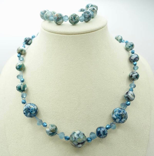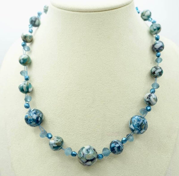 Ketting in petrol, turquoise, wit van geperst parelmoer. Afgewisseld met kleine facet geslepen kraaltjes. Ook mooi met armband ARtu022125.