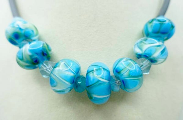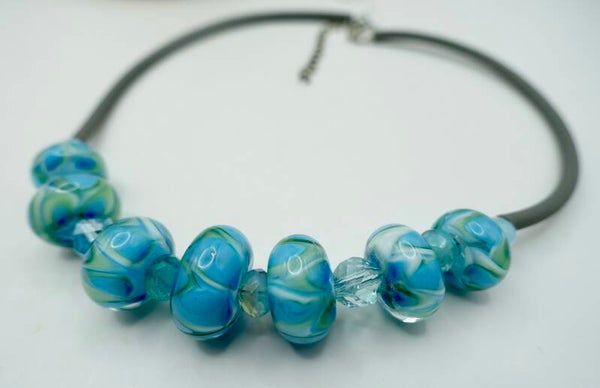 Ketting van handgemaakte, turquoise glaskralen uit eigen atelier. In de hals zacht grijs rubber voor het draagcomfort. Let op het mooie motief van de kralen; een soort driehoeksvorm.