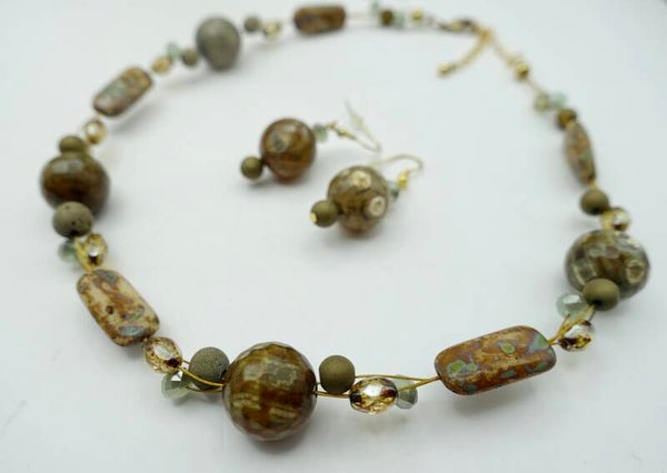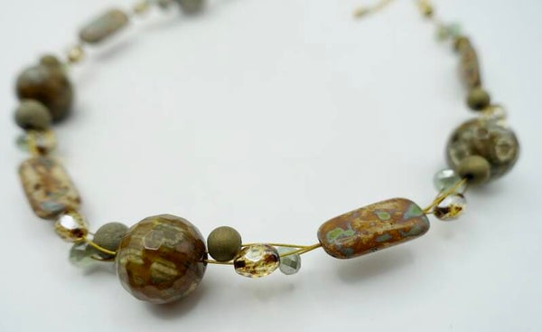 Kettinkje in bruin, terra, groen en ecru van bijzondere, halfedelsteensteen kralen, afgewisseld met goldfilled goudkraaltjes. Mooi met oorbelletjes OBbr022225.