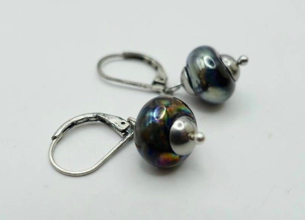 Grijs/paars/blauwe oorhangers van parels. Mooi afgewerkt met kralenkapjes.