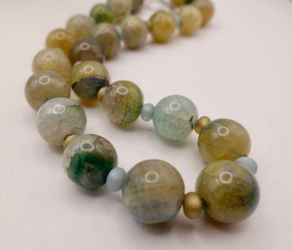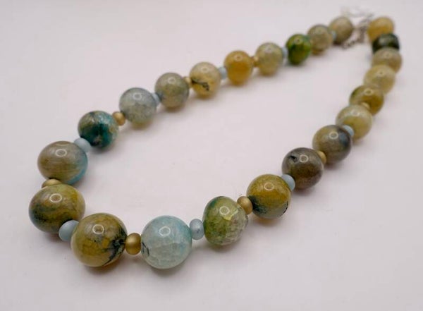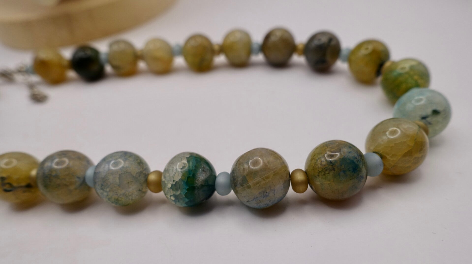 Vuuragaat ketting in groen/turquoise/taupe. Prachtige kralen in mooie kleuren, afgewisseld met Polaris kralen in fraaie, zachte tinten.