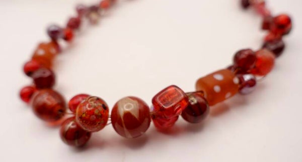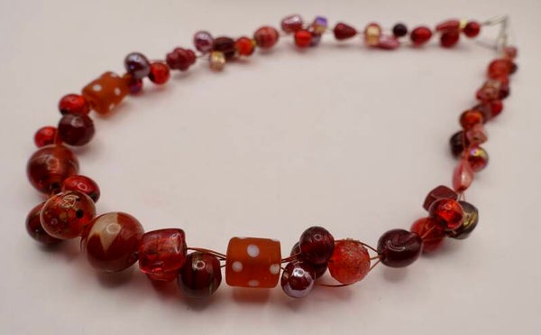 Warmrode ketting in diverse roodtinten; glaskralen in diverse vormen. Indiase glaskralen. Ietsje langer dan normaal.