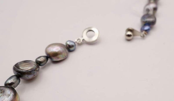 Grijsblauwe parelketting van barok- en kleine zoetwaterpareltjes. Afgewerkt met prachtig slotje dat je niet alleen in de hals maar ook halverwege voor kunt dragen.