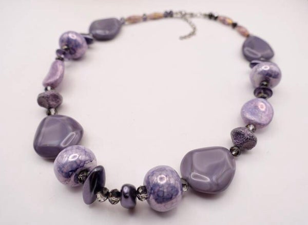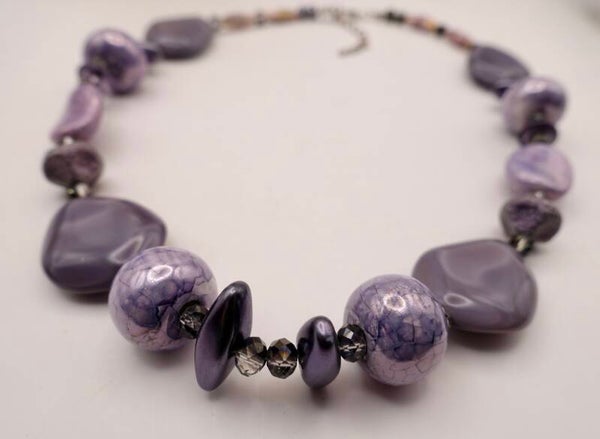 Lila, paarse ketting van Grieks keramiek, glas, diverse materialen, etc. Een plaatje. Valt prachtig om de hals.