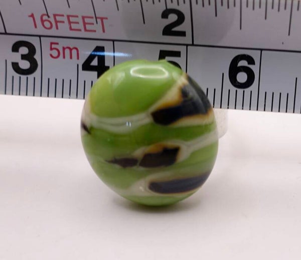 Groen, taupe, ecru, verstelbaar, glazen ring, doorsnee ca. 2 cm. Handmade in eigen atelier. Met zilvermetaal afgewerkt.