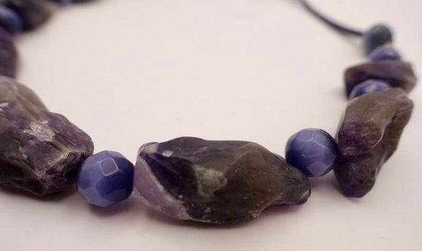 Paarse ketting van rough, iced amethyst, facet glaskralen en tijgeroog donutkralen. Afgewerkt met leer in de hals voor het ultieme draagcomfort.