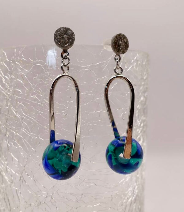 Petrol/blauwe oorbellen in DQ zilvermetalen hangers. Prachtige zetting, handgemaakte kralen (uit eigen atelier). Totale lengte 5cm.