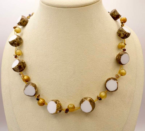 Ketting in houtmotief kralen met wit van binnen, met beige tijgeroogkraaltjes. Diverse kleine kraaltjes in bruintinten. Superlicht, heel apart.