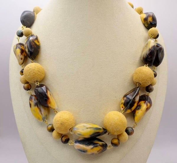 Ketting van okergele imi mosselschelpen en lava kralen in grote en kleine maat. Dubbele rijen. Super licht.