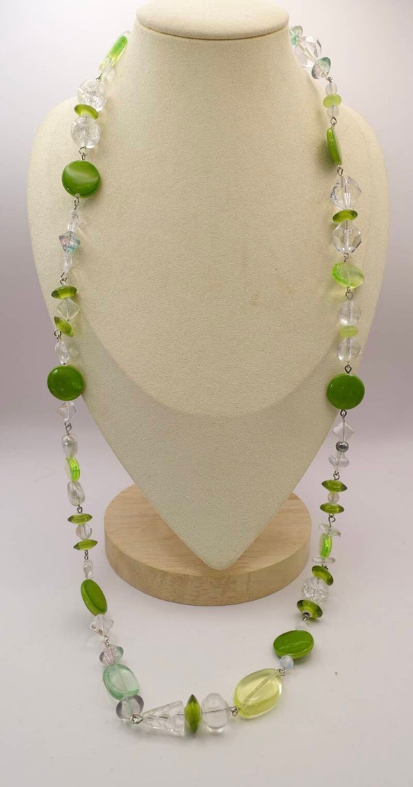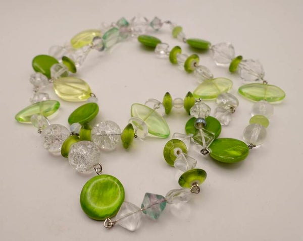Lange ketting in diverse groentinten, ook dubbel te dragen. Fel lime, transparant, zachtgroen, etc. Ook leuk met oorbellen OBgr012625.