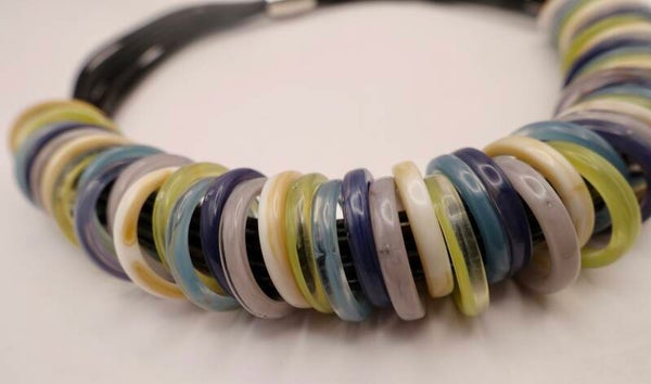 Heel aparte ketting van kunststof ringen in naturel en blauwtinten. Blauw, beige, ecru, etc. Met stoere magneetsluiting. Deze ketting is super licht en heel speciaal.
