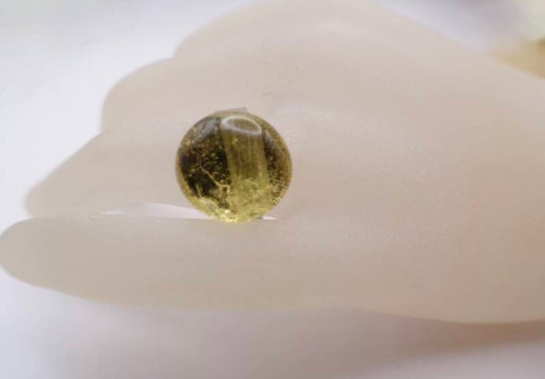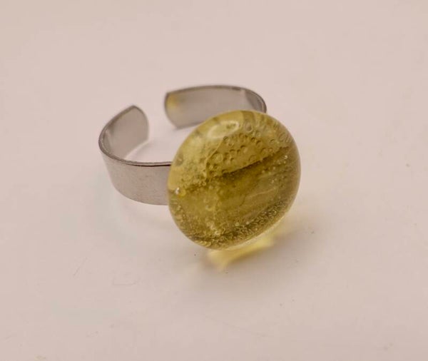 Verstelbare, zilvermetalen ring in transparant geel/goud glas, gemaakt in eigen atelier.