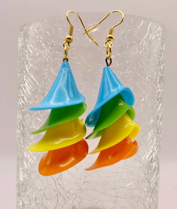 Vrolijke oorbellen in turquoise, groen, geel en oranje. Aronskelkjes afgewerkt met goudmetalen hangers.