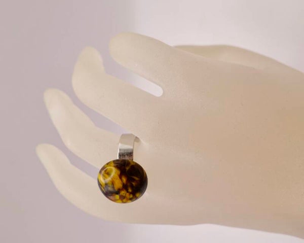 Ronde, verstelbare ring van glas. Handgemaakt in eigen atelier. In de kleuren bruin en oker. Doorsnee ca. 1,5cm. Kijk ook eens bij de andere ringen, allemaal uniek.