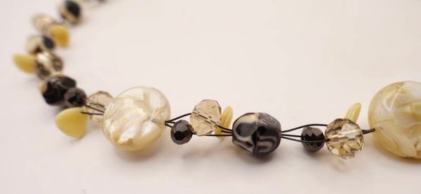 KKec013125: Zwart met ecru ketting van parelmoer en diverse soorten glaskralen.