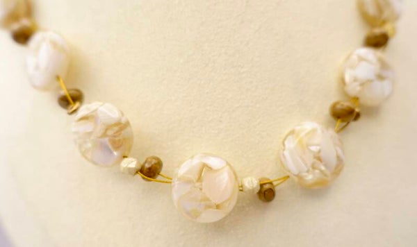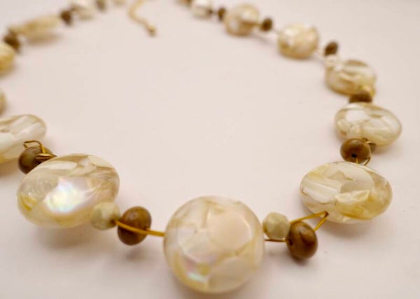 Ecru ketting van barok parels, geperst parelmoer en wood lace kralen. Warme uitstraling, passend bij vrijwel elke kleurencombinatie, zowel sportief, chique als zakelijk te dragen.